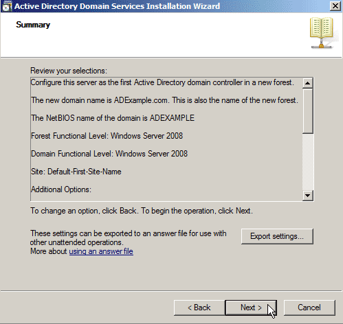 Si vous envisagez de créer plus de contrôleurs de domaine avec les mêmes paramètres, cliquez sur le boutonExporter les paramètres…pour enregistrer une copie texte des paramètres à utiliser dans un fichier de réponses pour une installation par script. Après avoir exporté et vérifié les paramètres, cliquez surSuivant.
