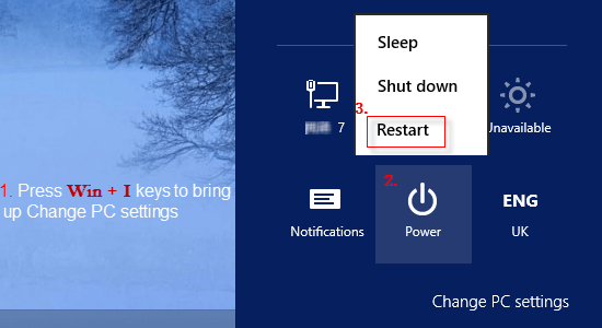 Sous Windows 8.1, appuyez surGagner + jeclés à évoquerModifier les paramètres du PC, puis cliquez surPouvoiricône et sélectionnez l'icôneRedémarrageoption tout en maintenant enfoncée la toucheChangementclé.