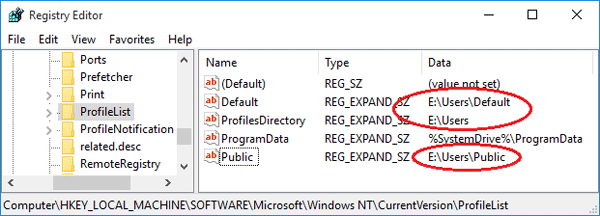 - Dans le volet de droite, nous devons modifier la valeur de ces entrées : Default, ProfilesDirectory et Public. Remplacez %SystemDrive%\Users par votre nouveau répertoire de profil, tel que E:\Users. Après avoir modifié les valeurs, cela devrait ressembler à la capture d'écran suivante.