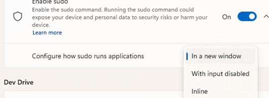 Sudo pour Windows exécute des applications avec des privilèges élevés danstroismodes. Ces modes peuvent être sélectionnés depuis l'application Paramètres ou spécifiés depuis la ligne de commande.