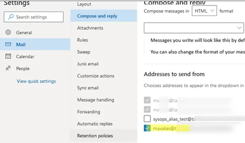 Si vous utilisez Outlook pour le Web, ouvrez les paramètres de votre boîte aux lettres (Paramètres -> Mail ->Composer et répondre). Découvrez leAdresses à partir desquelles envoyersection. Ici, vous pouvez vérifier les adresses SMTP supplémentaires qui seront disponibles dans le champ De lorsque vous envoyez un e-mail depuis Outlook.