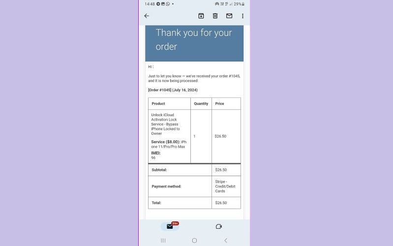 Étape 5.Après le paiement, vous verrez une confirmation de commande sur le site lui-même. Vous recevrez également un e-mail avec les détails de votre commande et votre identifiant.