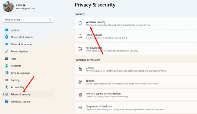 2. Cliquez ensuite surConfidentialité et sécurité > Sécurité Windows.