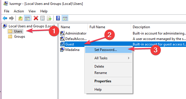 2. Sélectionnez Utilisateurs dans la fenêtre Utilisateurs et groupes locaux, puis cliquez avec le bouton droit surInvité>Propriétés.