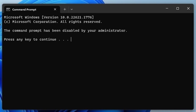 8. Redémarrez votre ordinateur. Après le redémarrage, lancez l'invite de commande. Vous serez accueilli par un message indiquant que CMD a été désactivé.