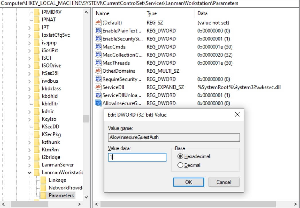 - Nommez-le AllowInsecureGuestAuth et définissez sa valeur sur 1.