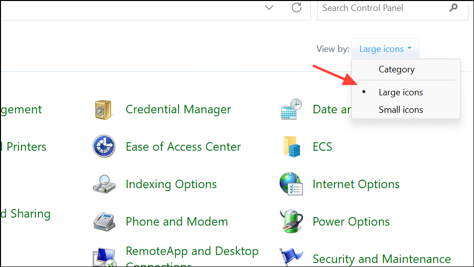 Étape 1 :Fermez complètement Outlook. Ouvrez le Panneau de configuration Windows et définissez la vue surLarge iconspour une navigation plus facile.