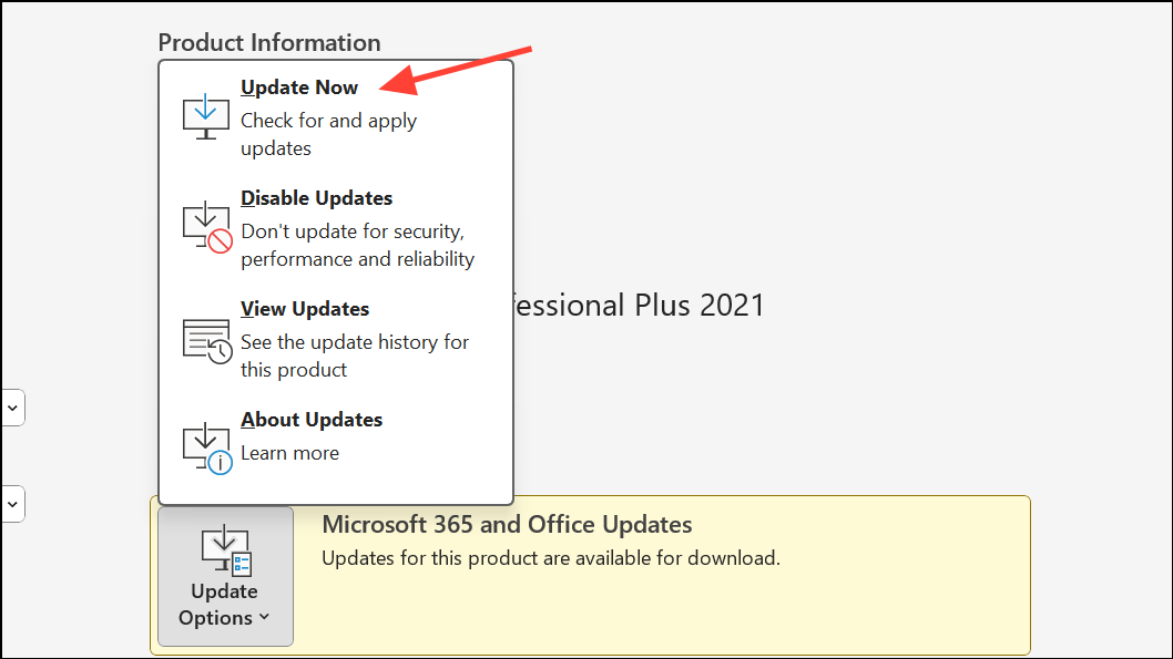 Étape 1 :Ouvrez Outlook, accédez auFilemenu et sélectionnezOffice AccountouAccount. CliquezUpdate Optionset choisissezUpdate Now. Cela télécharge et installe les dernières corrections de bogues et mises à jour de compatibilité pour Outlook.