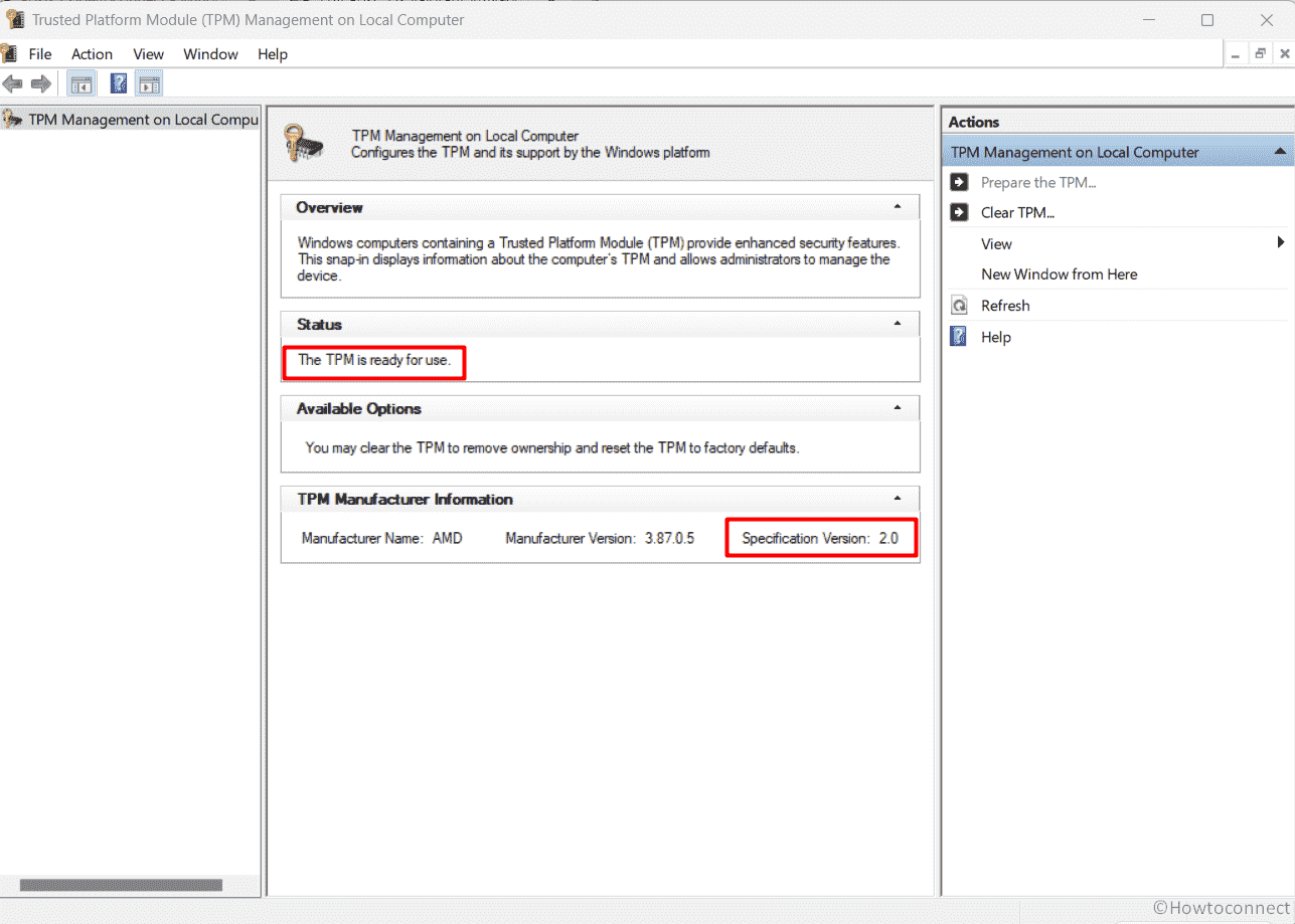 - Dans la fenêtre Gestion du module de plateforme sécurisée (TPM) sur l'ordinateur local, accédez àStatutsection. Ici tu devrais voirLe TPM est prêt à être utilisé.