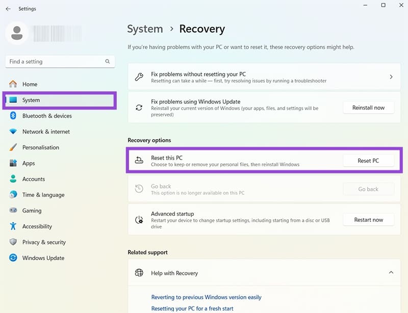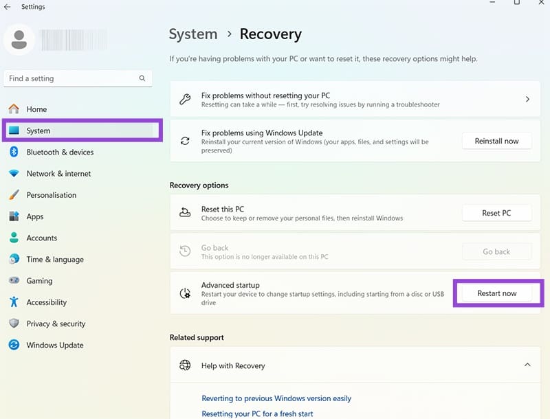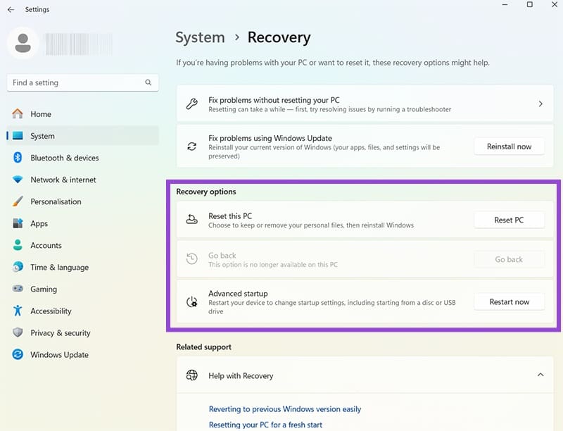 Si la limite de 10 jours est dépassée ou si le bouton Revenir en arrière est grisé, vous devrez utiliser le mode de récupération. Cela aide également si votre système ne démarre pas correctement.