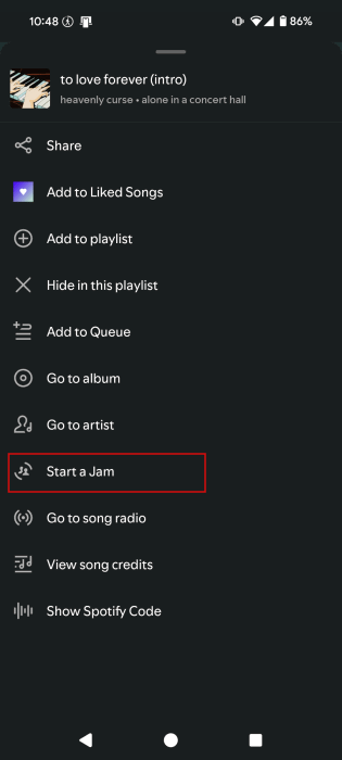 SélectionnerDémarrer un Jamdans la liste des options. Si vous suivez cette voie, la file d'attente de votre Jam comprendra principalement des chansons de cette liste de lecture.