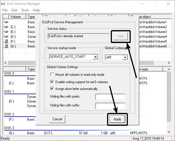 Assurez-vous simplement que le service est démarré,sinon cliquez sur'Commencer'pour démarrer le service. Vous pouvez même modifier les paramètres selon vos besoins pour pouvoir écrire sur des systèmes de fichiers EXT et bien d'autres.