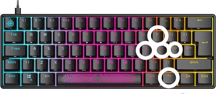 Pour utiliser un clavier à 60 %, maintenez la toucheTouche Fnet frappe leTouche « P »pour leflèche vers le haut, le« ; » clépour leflèche vers le bas, le“L” keypour imiter leflèche gauche, et le" ' " clépour leflèche droitefonction. Vous pouvez également télécharger un logiciel pour votre modèle de clavier 60 % afin d'utiliser les touches manquantes ou d'utiliser le clavier comme un clavier standard.