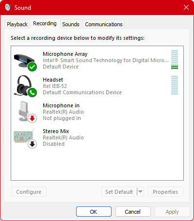 - De là, vous pouvez voir le «Réseau de microphones". Il s'agit du microphone interne ; vous pouvez voir les niveaux devant lui. Parlez près de votre ordinateur portable, devant ou près de la caméra, pour vérifier l'emplacement du microphone.