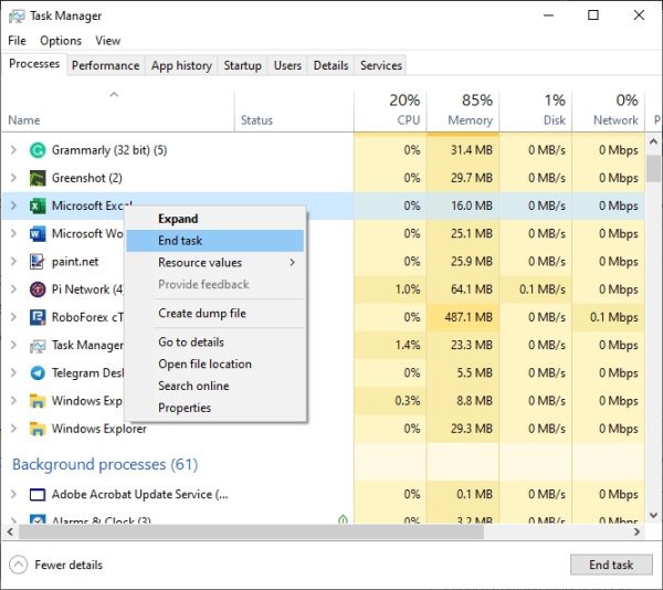 OK, pour faire ce travail, veuillez ouvrir leGestionnaire de tâchesen cliquant avec le bouton droit sur la barre des tâches, puis sélectionnez Gestionnaire des tâches. Une fois l'application ouverte, sélectionnez leOnglet Processus, puis localisez toutes les applications en cours d'exécution que vous n'utilisez pas.Clic droitsur chacun et sélectionnezFin de tâchepour les fermer.
