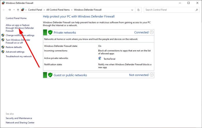 Dans la zone de recherche de Windows, tapez Pare-feu Windows, et via les résultats de la recherche, continuez et sélectionnezPare-feu Windows Defenderde la liste. Une fois l'application opérationnelle, regardez dans le panneau de gauche et sélectionnez.