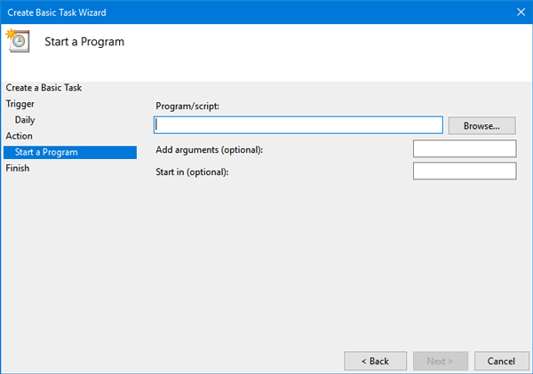 Après cela, choisissez,Démarrer un programmedans leActionsection. Sur la page suivante, saisissez la ligne suivante dans le champProgramme/scriptzone de chemin ;