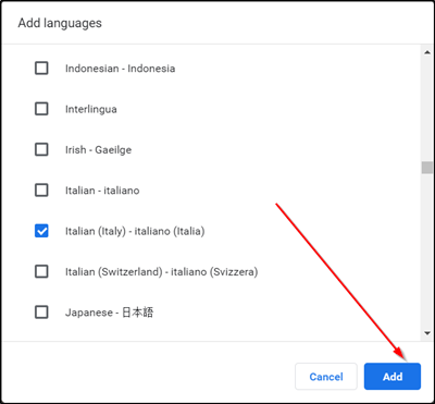 Ensuite, sélectionnez 'Ajouter'pour ajouter la langue. Votre navigateur téléchargera le module linguistique et l'ajoutera automatiquement. Si un dictionnaire est disponible pour la langue, il sera également téléchargé.