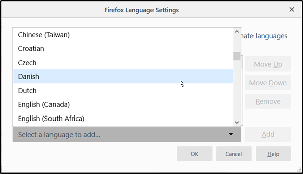 Une fois l’ordre des langues déterminé, la priorité dans laquelle elles doivent être utilisées sera fixée. Vous pouvez le modifier à tout moment en déplaçant simplement les boutons vers le haut ou vers le bas. Principalement, la préférenceintl.locale.requesteddétermine la priorité des langues dans le navigateur Mozilla. Cependant, il n'est vu ou visible que si deux langues ou plus sont installées dans le navigateur.