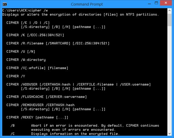 cipher /w:driveletter:\foldernameIci, vous devrez spécifier la lettre du lecteur et le nom ou le chemin du dossier.