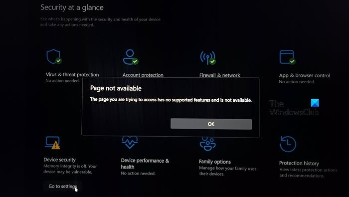 Si vous avez remarqué que leLa page Isolation de base, visible dans la sécurité Windows, est manquantedepuis votre ordinateur Windows, cet article vous aidera à résoudre le problème. Il s'agit d'un problème très critique car le manque d'intégrité de la mémoire rend votre ordinateur vulnérable aux attaques malveillantes. Le message que vous pouvez voir est :