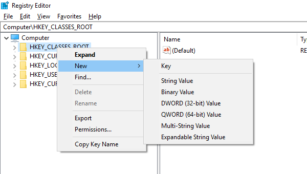 Créer une clé de registre est simple. Faites un clic droit sur n’importe quel dossier ou espace blanc et choisissezNouveau. Vous pouvez créer une clé,Valeur de chaîne, valeur binaire, valeur DWORD (32 bits), valeur QWORD (64 bits), valeur multi-chaîne ou valeur de chaîne extensible. Cette méthode est utile lorsque vous envisagez d'effectuer une modification mineure pour résoudre un problème sur votre ordinateur. Cela peut être lié à une application ou au niveau du système d’exploitation.