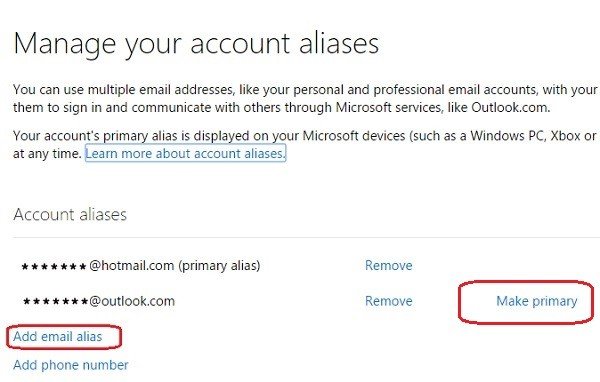 - Ici, vous pouvez également modifier votre alias principal. Comme nous le savons, notre alias principal apparaît lorsque nous partageons du contenu depuis nos appareils, à condition que nous soyons connectés, tels que Xbox, Surface, etc. Vous pouvez faire de votre nouvel alias l'alias principal et supprimer l'ancien. Veuillez noter que vous ne pouvez pas modifier votre alias principal plus de deux fois par semaine.