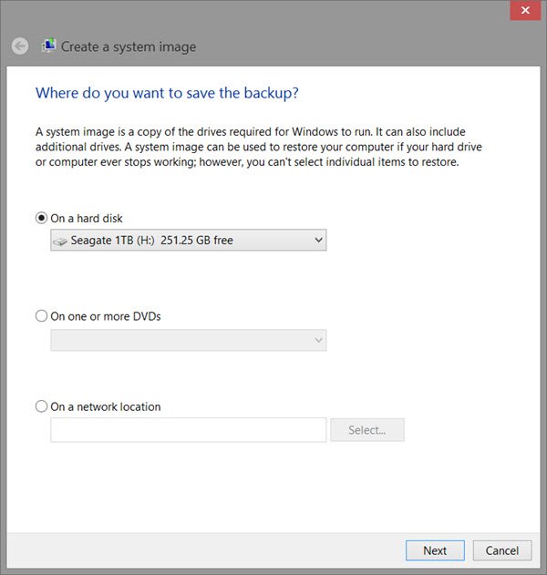 UNCréer une image systèmeL'assistant s'ouvrira. Une image système est une copie des lecteurs requis pour l'exécution de Windows. Il peut également inclure des lecteurs supplémentaires. Cette image peut être utilisée pour restaurer votre ordinateur si votre disque dur ou votre ordinateur cesse de fonctionner ; cependant, vous ne pouvez pas sélectionner des éléments individuels à restaurer.