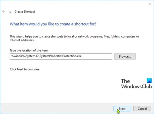 - TaperProtection du système(ou tout autre nom de votre choix) dans leTapez un nom pour ce raccourcichamp.