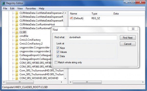 Ici, faites un clic droit sur CLSID et sélectionnezTrouverrechercherne pas actualiser.