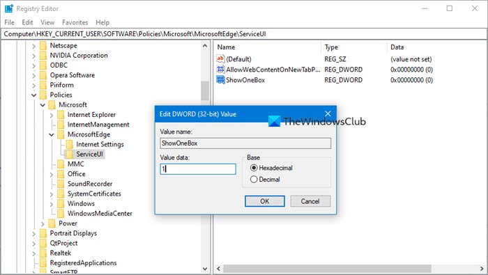 La deuxième façon d'activer ou de désactiver la suggestion de liste déroulante de la barre d'adresse Edge consiste à créer une valeur DWORD dans le registre Windows. Les utilisateurs des éditions familiales de Windows peuvent utiliser cette solution pour désactiver complètement la suggestion de liste déroulante dans les paramètres de Microsoft Edge.
