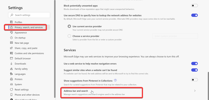 Une nouvelle fenêtre s'ouvrira à partir de laquelle vous pourrez modifier les paramètres de suggestion déroulante de la barre d'adresse Edge.