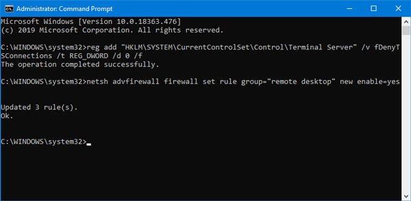 reg add "HKLM\SYSTEM\CurrentControlSet\Control\Terminal Server" /v fDenyTSConnections /t REG_DWORD /d 0 /f