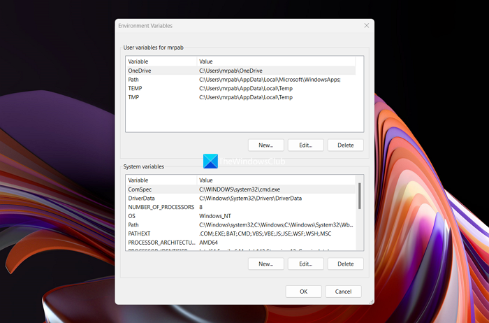 Ouvrez les variables d'environnement sur votre PC Windows 11 ainsi que sur d'autres PC Windows 11 et comparez-les tous les deux. Assurez-vous que les deux versions de Windows 11 correspondent avant de comparer les variables. Si vous trouvez des variables manquantes, ajoutez-les en cliquant sur le bouton Nouveau sous Variables utilisateur et Variables système en fonction de la variable manquante. Ajoutez exactement la variable et redémarrez votre PC pour voir si cela vous a aidé à résoudre le problème.