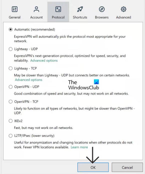 La prochaine chose que vous pouvez faire pour résoudre le problème consiste à modifier le protocole VPN. Les protocoles VPN sont les procédures permettant de connecter votre PC ou un autre appareil à un serveur VPN. Par défaut, il est défini surAutomatiqueoption de protocole. Cependant, comme ExpressVPN ne se connecte pas correctement avec l'option de protocole automatique, vous pouvez essayer de la modifier et voir si le problème est résolu. Voici les étapes pour ce faire :