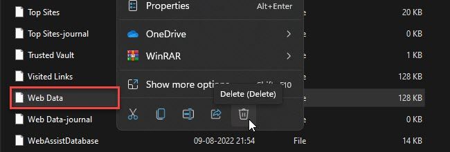 - Faites un clic droit sur leDonnées Webfichier et appuyez sur lePoubelleicône.