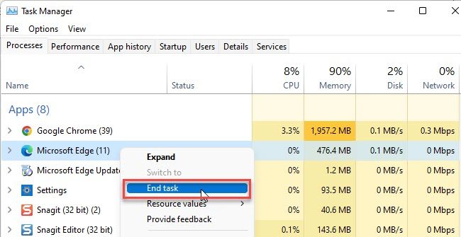 Parfois, il peut y avoir un problème temporaire dans les processus Edge exécutés en arrière-plan. Essayez de mettre fin à ces processus pour voir si cela résout l'erreur de profil sur Microsoft Edge.