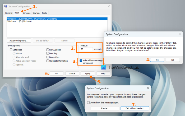 1] Modifier le délai d'expiration du menu de démarrage à l'aide des options de démarrage sous Windows 11/10
