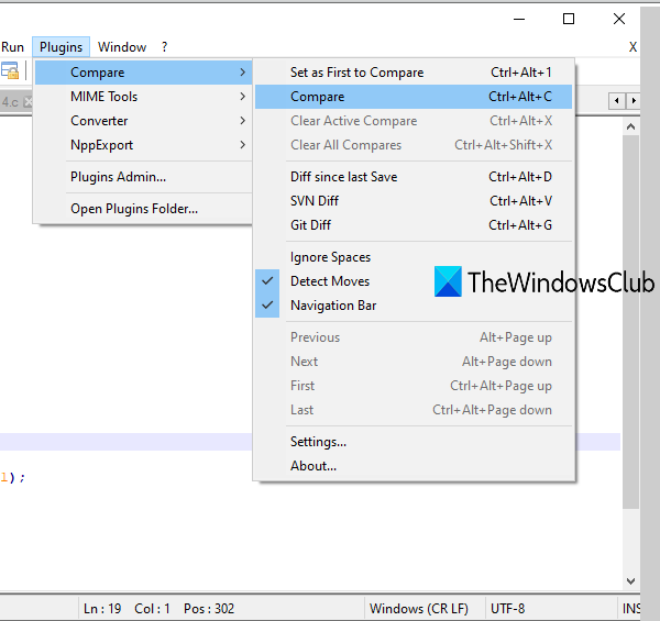 Ouvrez maintenant deux fichiers dans Notepad++ que vous souhaitez comparer. Après cela, cliquez sur le menu Plugins et accédez au plugin Compare. Vous verrez les options suivantes :