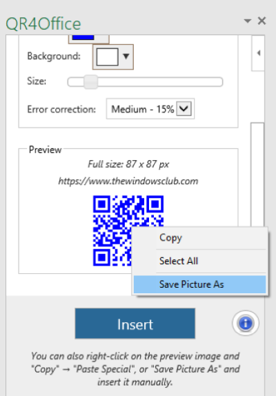 2] Après cela, il sera disponible sur le panneau de droite, tout comme dans PowerPoint. Maintenant, vous devez répéter les mêmes étapes que dans PowerPoint pour créer un code QR. Si le «Insérer" L'option ne fonctionne pas, vous pouvez copier le code QR et le coller dans la cellule respective. Si vous ne parvenez pas à coller le code QR, enregistrez-le sur votre ordinateur en faisant un clic droit dessus.