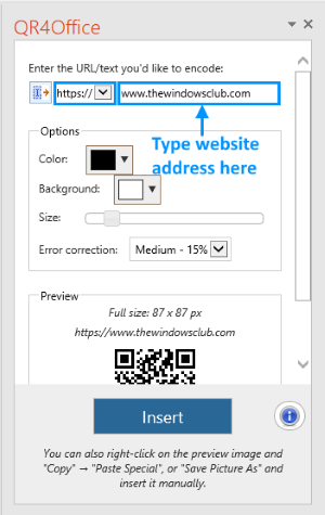 5] Votre QR code est prêt, insérez-le dans le slide en cliquant sur le «Insérer" Bouton. Le bouton « Insérer » n'a pas fonctionné pour moi. Par conséquent. J'ai inséré le code dans la diapositive en le copiant et en le collant manuellement. Vous pouvez copier le code en cliquant dessus avec le bouton droit. Si Ctrl+V ne fonctionne pas, collez-le par un clic droit. Ou vous pouvez télécharger l'image sur votre ordinateur et l'insérer dans les diapositives PowerPoint.