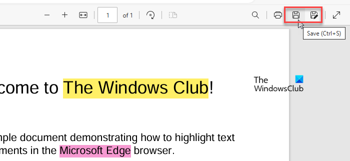 Pour enregistrer le PDF en surbrillance, vous pouvez cliquer sur le bouton 'Sauvegarder'icône présente dans le coin droit juste au-dessus du fichier PDF. Cela enregistrera les modifications apportées au PDF existant. Si vous souhaitez enregistrer le PDF en surbrillance en tant que document distinct, cliquez sur le bouton 'Enregistrer sous'icône.