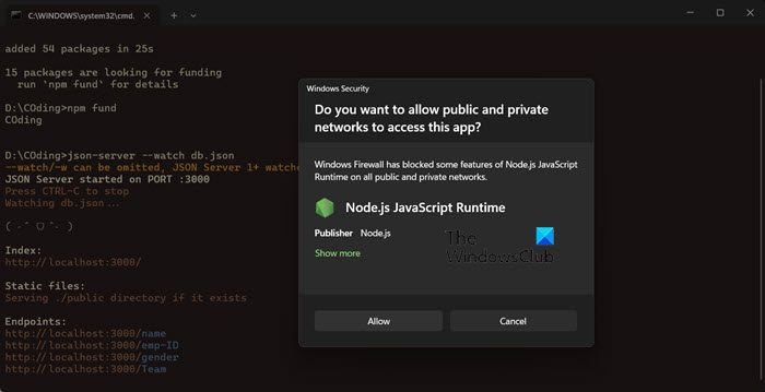 Il vous sera demandé d'autoriserExécution Javascript Node.JSpour y accéder par les réseaux Privés et Publics, cliquez surPermettre. La commande s'exécutera et donnera une sortie. Vous devez utiliser l'URL mentionnée ci-dessous pour indexer et la coller dans un navigateur pour ouvrir le serveur JSON.