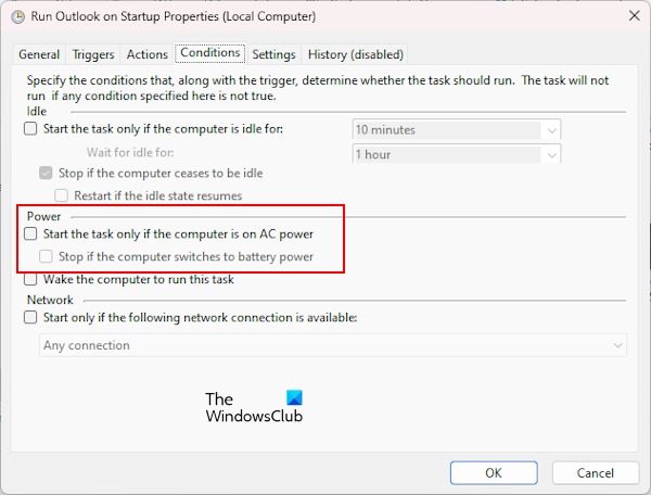 Si vous utilisez un ordinateur portable, décochez les options suivantes sousConditionslanguette.