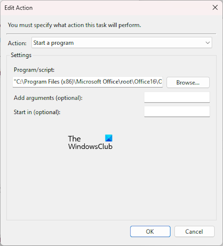 Maintenant, sélectionnez leActionlanguette. Sélectionnez Démarrer un programme dans leActiondérouler. Cliquez sur le bouton Parcourir et sélectionnez le fichier exe Outlook. CliquezD'ACCORD. Nous avons déjà parlé de l'emplacement du fichier exe Outlook ci-dessus dans cet article.
