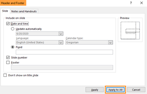 À la fin des paramètres, vous verrez un lien appelé"Modifier l'en-tête et le pied de page".Dans cette option, vous pouvez choisir de mentionner ou non la date et l'heure, le numéro de diapositive et le pied de page sur les copies imprimées. Cliquez« Appliquer à tous »pour continuer.
