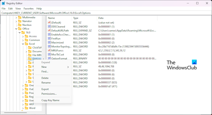 HKEY_CURRENT_USER\SOFTWARE\Microsoft\Office\16.0\Excel