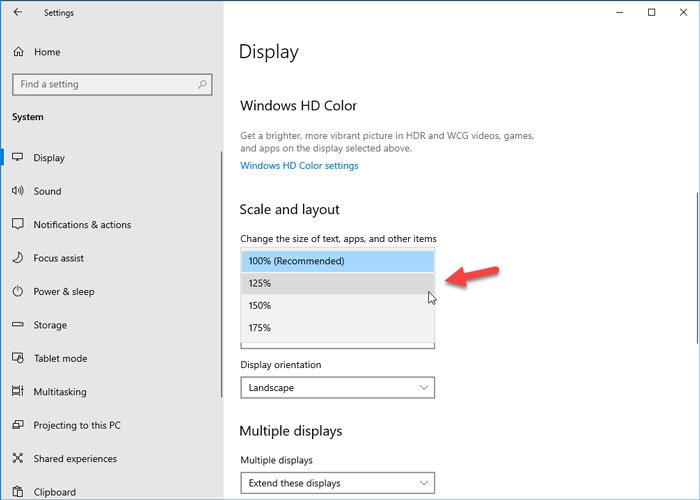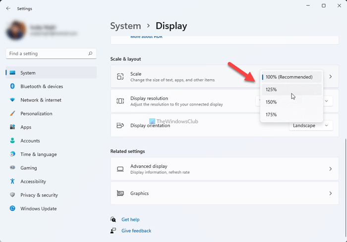 Après avoir sélectionné un moniteur, vous devez faire défiler jusqu'àÉchelle et dispositiontitre. Ici, vous devriez voir un menu déroulant que vous devez développer et choisir un niveau de mise à l'échelle. Comme d'habitude, il existe quatre paramètres de mise à l'échelle différents : 100 %, 125 %, 150 % et 175 %.