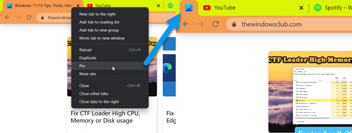 Si vous souhaitez que vos onglets soient plus petits, suivez simplement les étapes prescrites pour définir leur largeur. Cependant, si vous souhaitez simplement que l'icône de l'onglet soit dans la barre, vous devez épingler cet onglet. Par exemple, si vous souhaitez en savoir plus sur les ordinateurs Windows, la Xbox et d'autres produits Microsoft, continuez, cliquez avec le bouton droit sur l'icône TheWindowsClub et sélectionnez Épingler. Cela garantira que seule l’icône de cet onglet apparaît, vous laissant beaucoup de biens immobiliers.