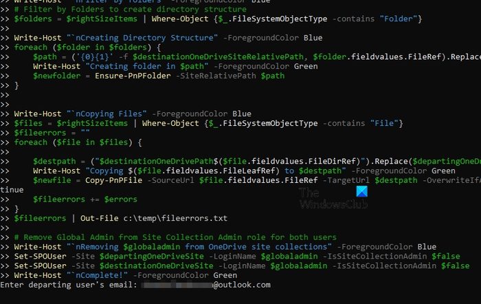Write-Host "`nConnecting to $departinguser's OneDrive via SharePoint Online PNP module" -ForegroundColor Blue